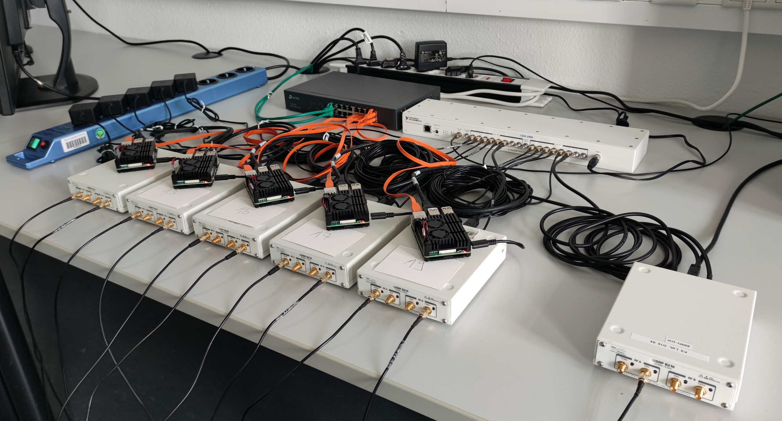 The next figures depict a global view of the demo system and a close view of the SDRs together with the controlling Raspberry Pis (RasPis), the reference clock as well as network